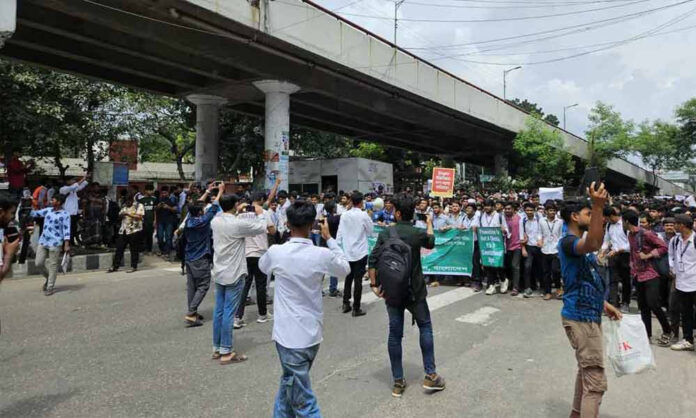 ছয় দফা দাবি বাস্তাবায়ন ও কারিগরি শিক্ষা ব্যবস্থা ধ্বংস ও প্রকৌশল কর্মক্ষেত্র কুক্ষিগত করার প্রতিবাদ জানিয়ে রাজধানীর তেজগাঁও সাতরাস্তা মোড়ে অবরোধ কর্মসূচি পালন করছেন কারিগরি শিক্ষার্থীরা। পূর্বঘোষিত কর্মসূচি অনুযায়ী শিক্ষার্থীরা বুধবার (১৭ সেপ্টেম্বর) বেলা সোয়া ১১টার দিকে সাতরাস্তা মোড় অবরোধ করেন। এতে ওই সড়কে যান চলাচল বন্ধ হয়ে যায়। ফলে ভোগান্তিতে পড়েন অফিসগামী যাত্রীরা।