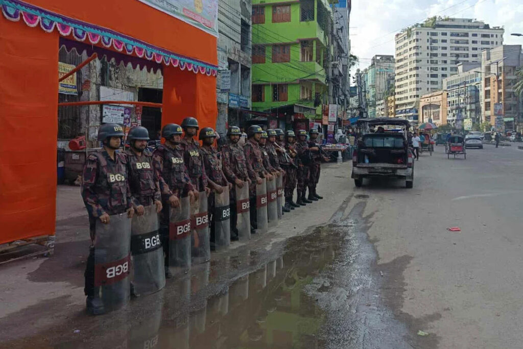 অনলাইন:সনাতন ধর্মাবলম্বীদের বৃহত্তম ধর্মীয় উৎসব শারদীয় দুর্গাপূজা-২০২৫ উপলক্ষ্যে সীমান্তবর্তী এলাকা এবং রাজধানী ঢাকাসহ সারাদেশের ২,৮৫৭টি পূজামণ্ডপের সার্বিক নিরাপত্তা নিশ্চিতে কাজ করছে বর্ডার গার্ড বাংলাদেশের (বিজিবি) ৪৩০ প্লাটুন সদস্য।