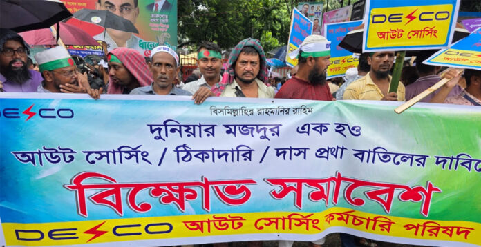 রনি মজুমদার. রাজধানীর জাতীয় প্রেসক্লাবের সামনে আজ (শনিবার) বিক্ষোভ সমাবেশ করেছে ঢাকা ইলেকট্রিক সাপ্লাই কোম্পানি লিমিটেড (ডেসকো)-এর আউটসোর্সিং কর্মচারীরা।“বিশ্বজুড়ে শ্রমিকের মজদুর এক হও”—এই স্লোগানকে সামনে রেখে তারা আউটসোর্সিং ও ঠিকাদারি পদ্ধতি বাতিল এবং ন্যায্য বেতন কাঠামোর দাবিতে এই কর্মসূচি পালন করেন।