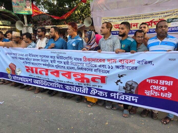 বক্তারা বলেন, বর্তমান আউটসোর্সিং পদ্ধতি শ্রমিকদের অধিকার হরণ করছে এবং চাকরির স্থায়িত্ব নষ্ট করছে। তারা দাবি জানান—দ্রুততম সময়ে ২০২৫ সালের নীতিমালা সংশোধন করে এই অমানবিক আউটসোর্সিং পদ্ধতি বাতিল করতে হবে। একই সঙ্গে সরকারি অফিসগুলোতে সরাসরি নিয়োগের ব্যবস্থা নিশ্চিত করতে হবে।