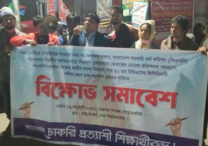 শিক্ষার্থীদের প্লাটফর্ম “চাকরি প্রত্যাশী শিক্ষার্থীবৃন্দ” ব্যানারে ‘সকল চাকরিতে মেধা ভিত্তিক নিয়োগে নাম্বার সহ ফলাফল প্রকাশ,বাংলাদেশ সরকারি কর্ম কমিশন( পিএসসি)পরিচালনায় সীমাহীন ব্যর্থতার দায়ে পিএসসির চেয়ারম্যান মোবাশ্বের মোনেম কমিশনের পদত্যাগ,পিএসসি’র গুণগত সংস্কার,জাতীয় সংসদ নির্বাচন পরে ৫০তম বিসিএসের প্রিলিমিনারি পরীক্ষা গ্রহণ, নন- ক্যাডার বিধিমালা সংশোধন এবং প্রশ্নফাঁস রোধের দাবি’তে এই বিক্ষোভ সমাবেশ অনুষ্ঠিত হয় ।