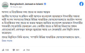 জাতীয় সংসদের সংরক্ষিত নারী আসনে দলীয় মনোনয়ন নিয়ে সামাজিক যোগাযোগমাধ্যমে ছড়িয়ে পড়া তথ্যের প্রতিবাদে বাংলাদেশ জামায়াতে ইসলামীর পক্ষ থেকে একটি আনুষ্ঠানিক বিবৃতি দেওয়া হয়েছে।